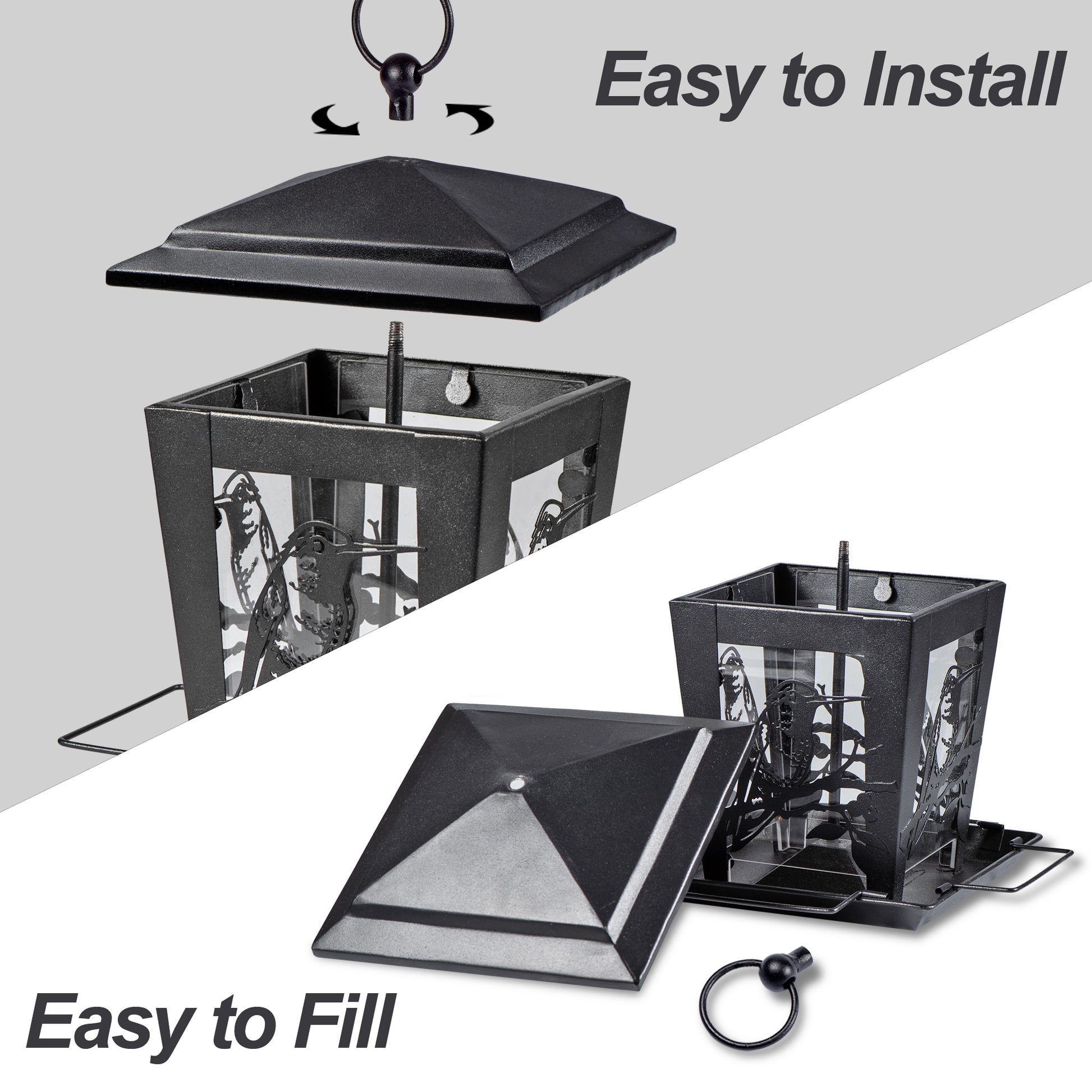 EASY TO USE And FILL: The wide mouth ensures effortless cleaning and filling. Holds up to 2.5 lb of seeds and It can be filled with all varieties of seeds, such as mixed seed, peanut, black oil sunflower seeds, safflower seeds, and cracked corn to attract cardinals, goldfinches, finches, blue jay, warblers, and more.
