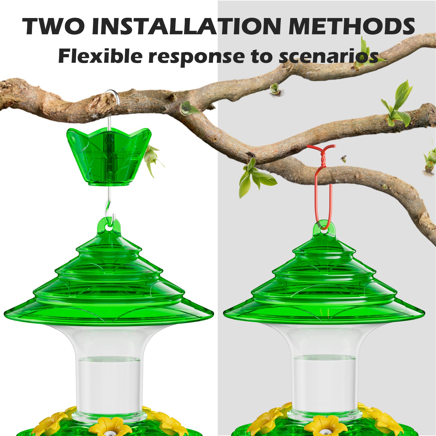 2 HANGING METHODS: The Birdream hummingbird feeder for outdoors comes with both an S-shaped hook and a ring rope, offering flexibility for various hanging scenarios. This makes installation easier and more convenient, wherever you choose to place it