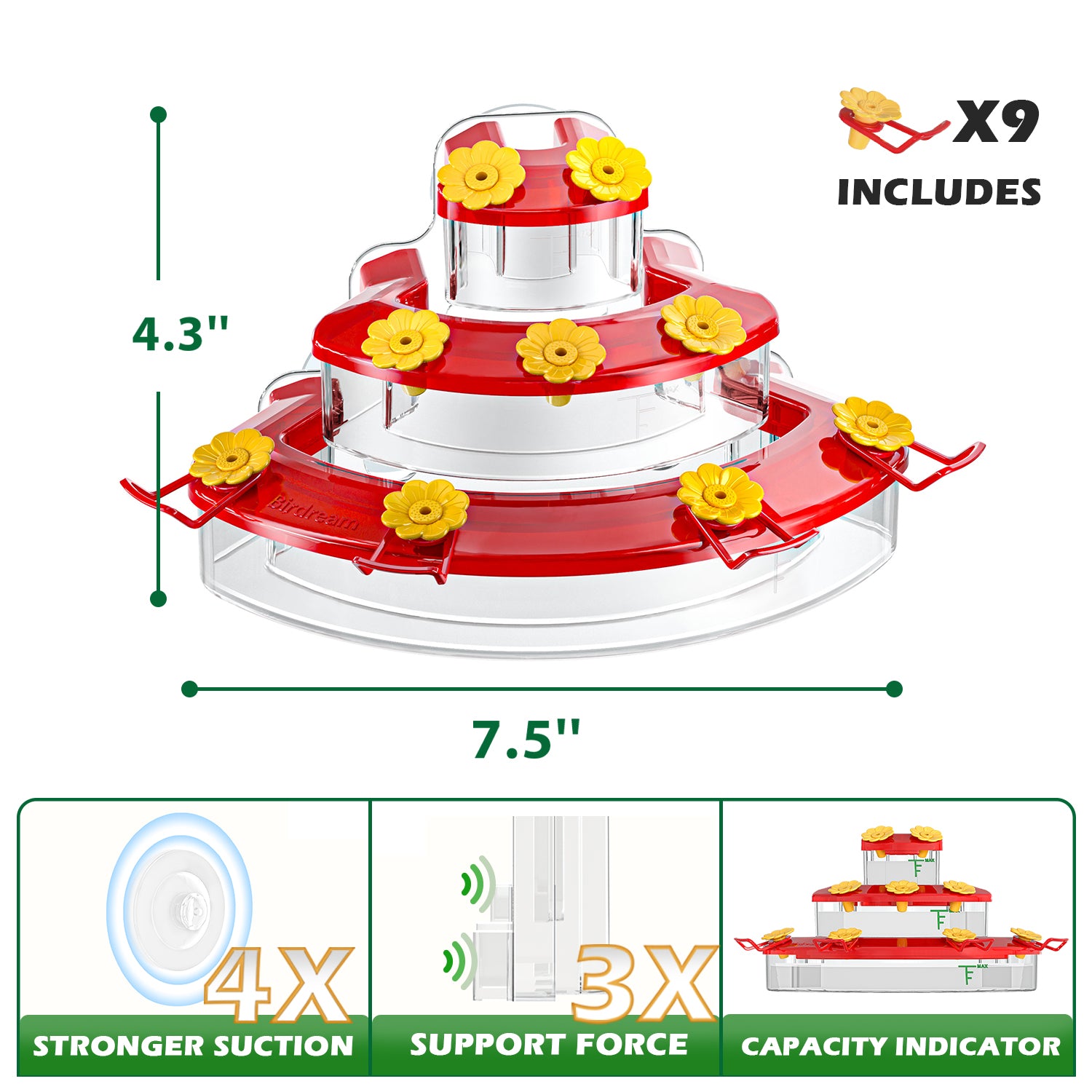 BRAND-NEW CAKE HUMMINGBIRD FEEDER: Featuring an innovative cake-inspired design, this feeder boasts 9 feeding ports and 3 nectar layers, creating a true "hummingbird oasis." It allows multiple birds to feed harmoniously, transforming your window into a captivating gateway to the enchanting world of hummingbirds