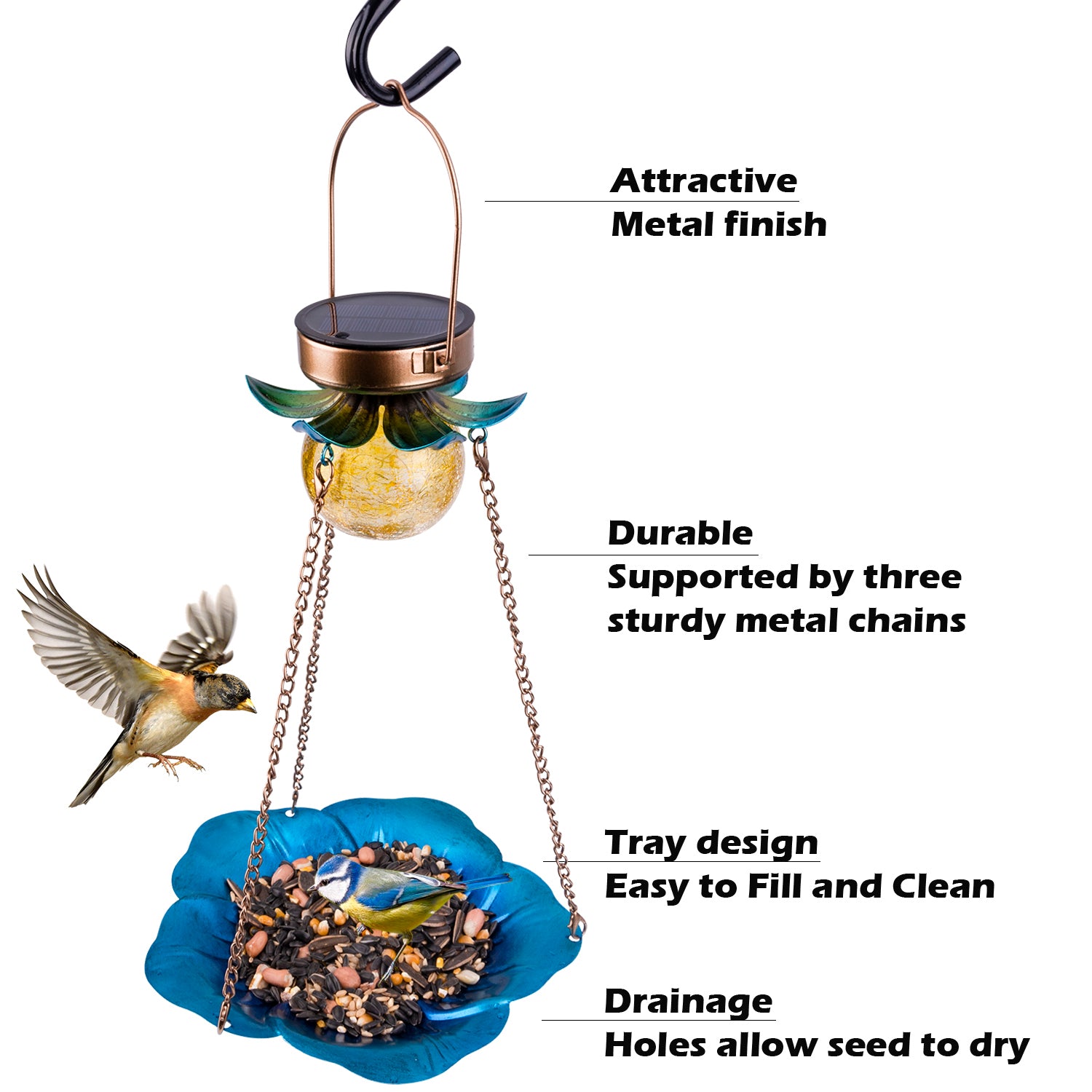 【Pretty Garden Decor】 The tray is the shape of a blue flower and the yellow light is designed with cracked glass like a beautiful crystal ball, providing warm light and a romantic atmosphere for your yard. It is not only a hanging bird feeder for outside but also a solar garden light decoration.